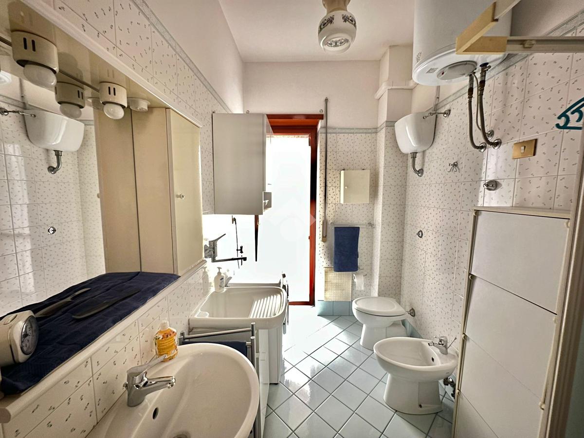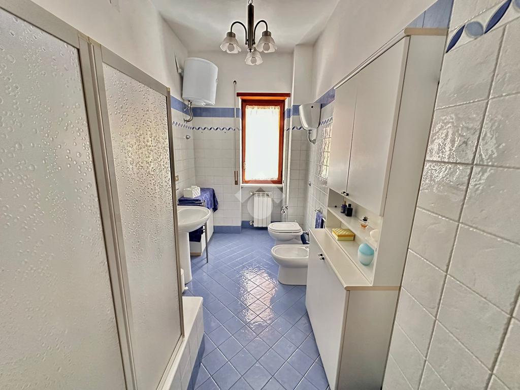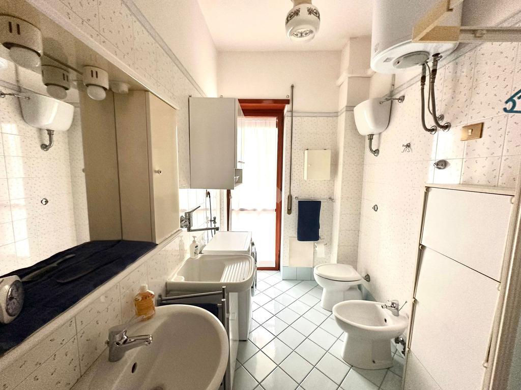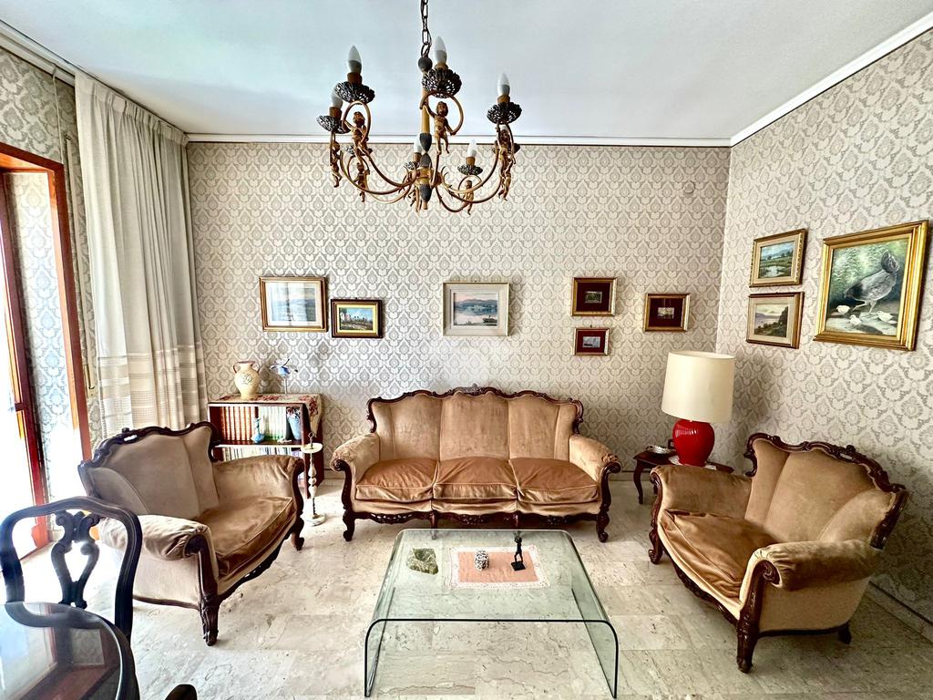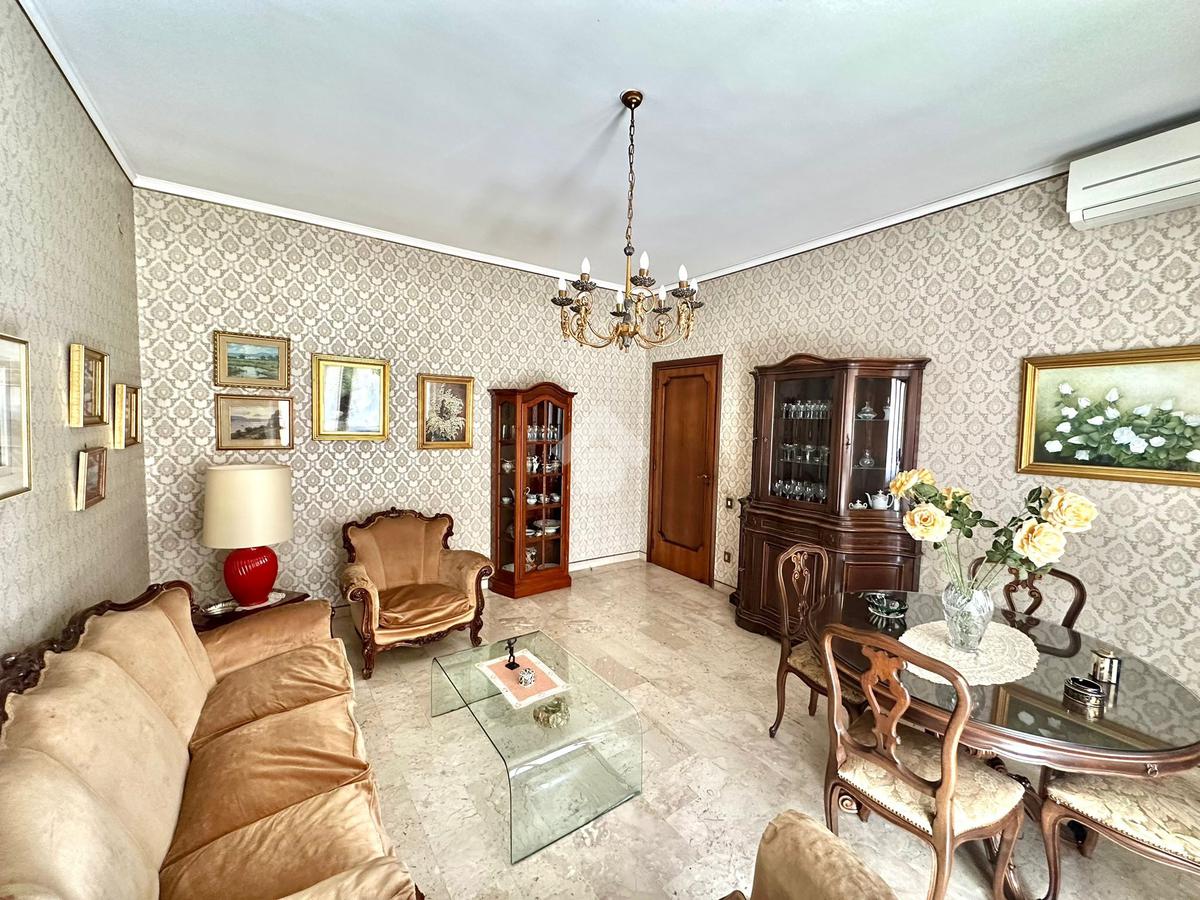 L'immobile, che si trova in un edificio in cemento armato dotato di ascensore, è composto da un ingresso in disimpegno, cucina abitabile, doppi servizi, salone e tre camere.