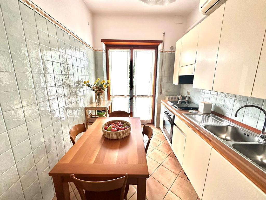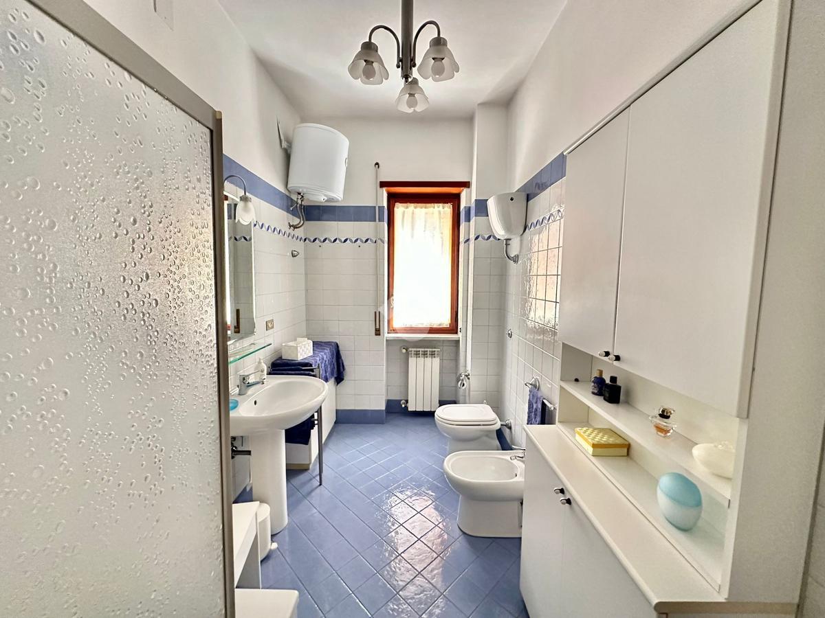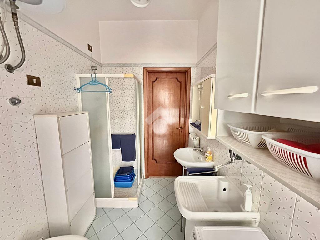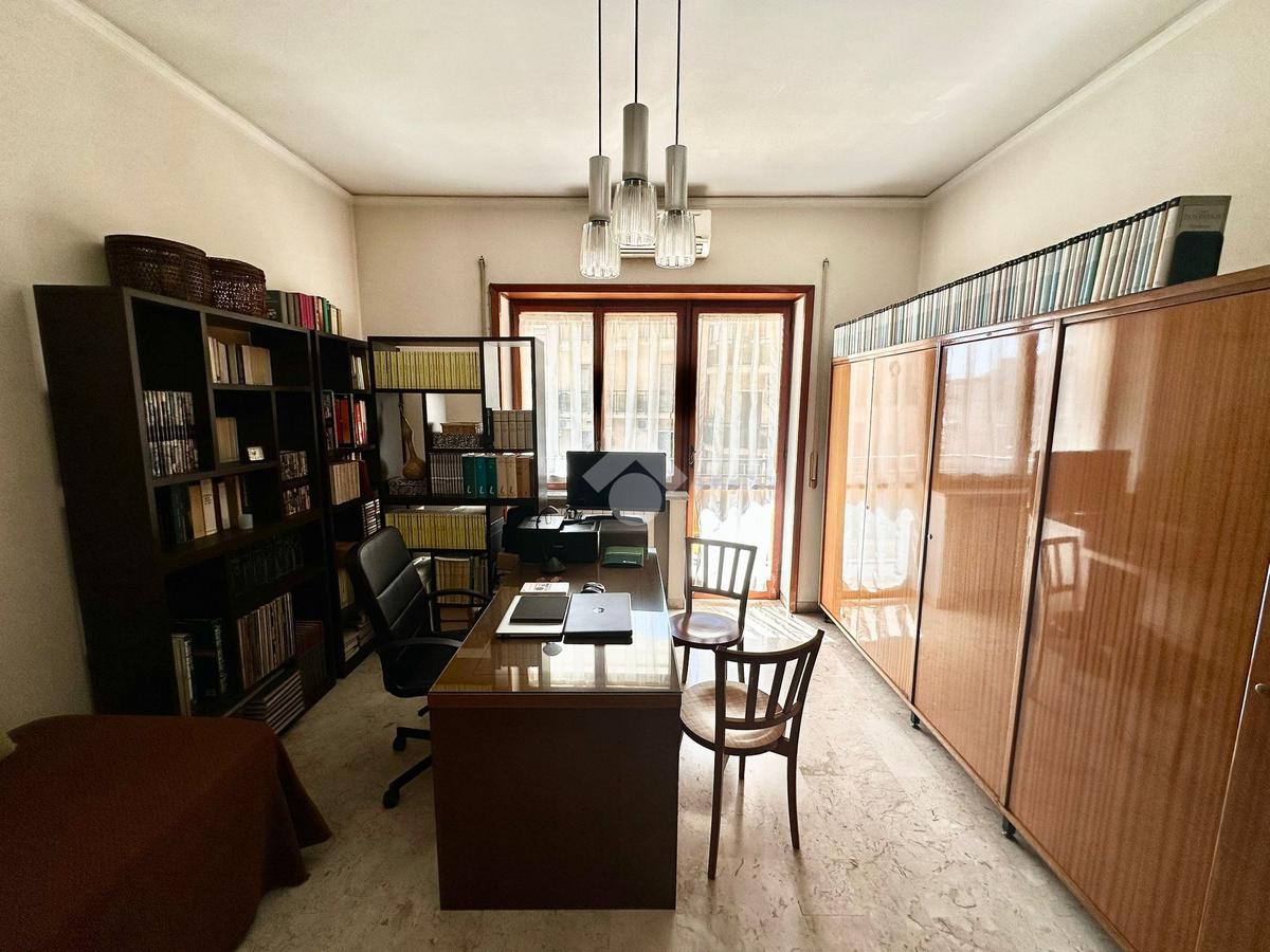 L'immobile, che si trova in un edificio in cemento armato dotato di ascensore, è composto da un ingresso in disimpegno, cucina abitabile, doppi servizi, salone e tre camere.