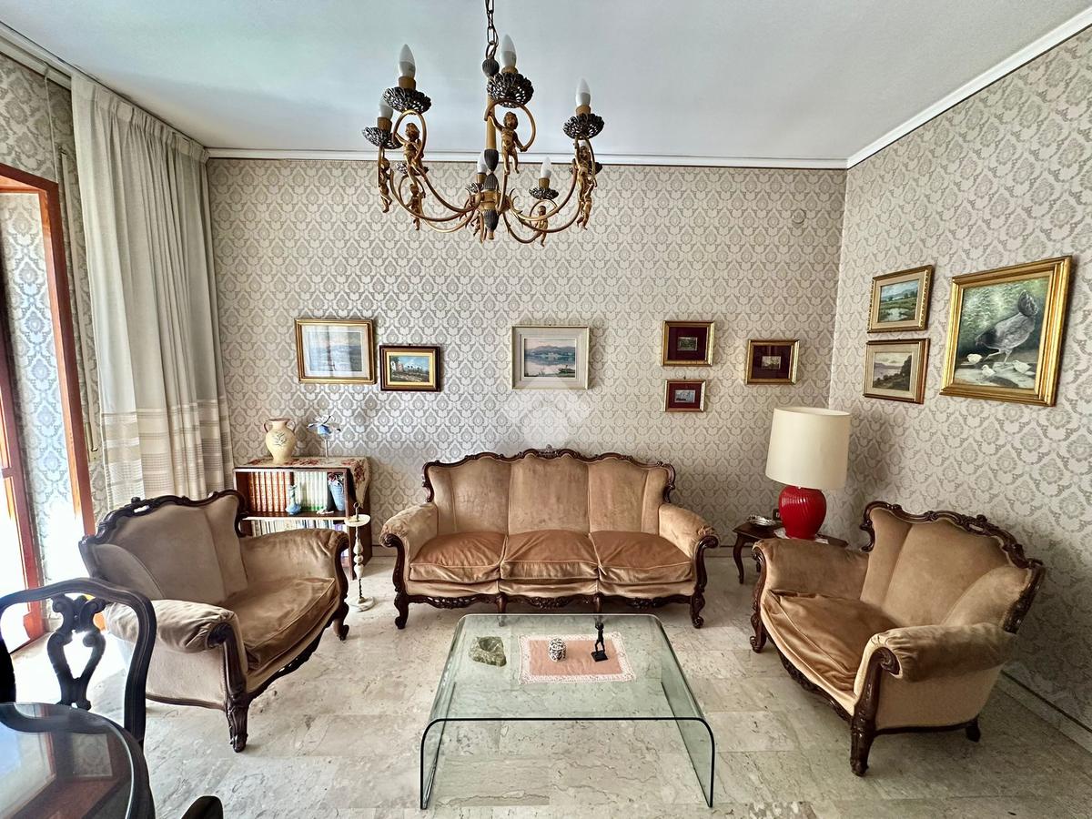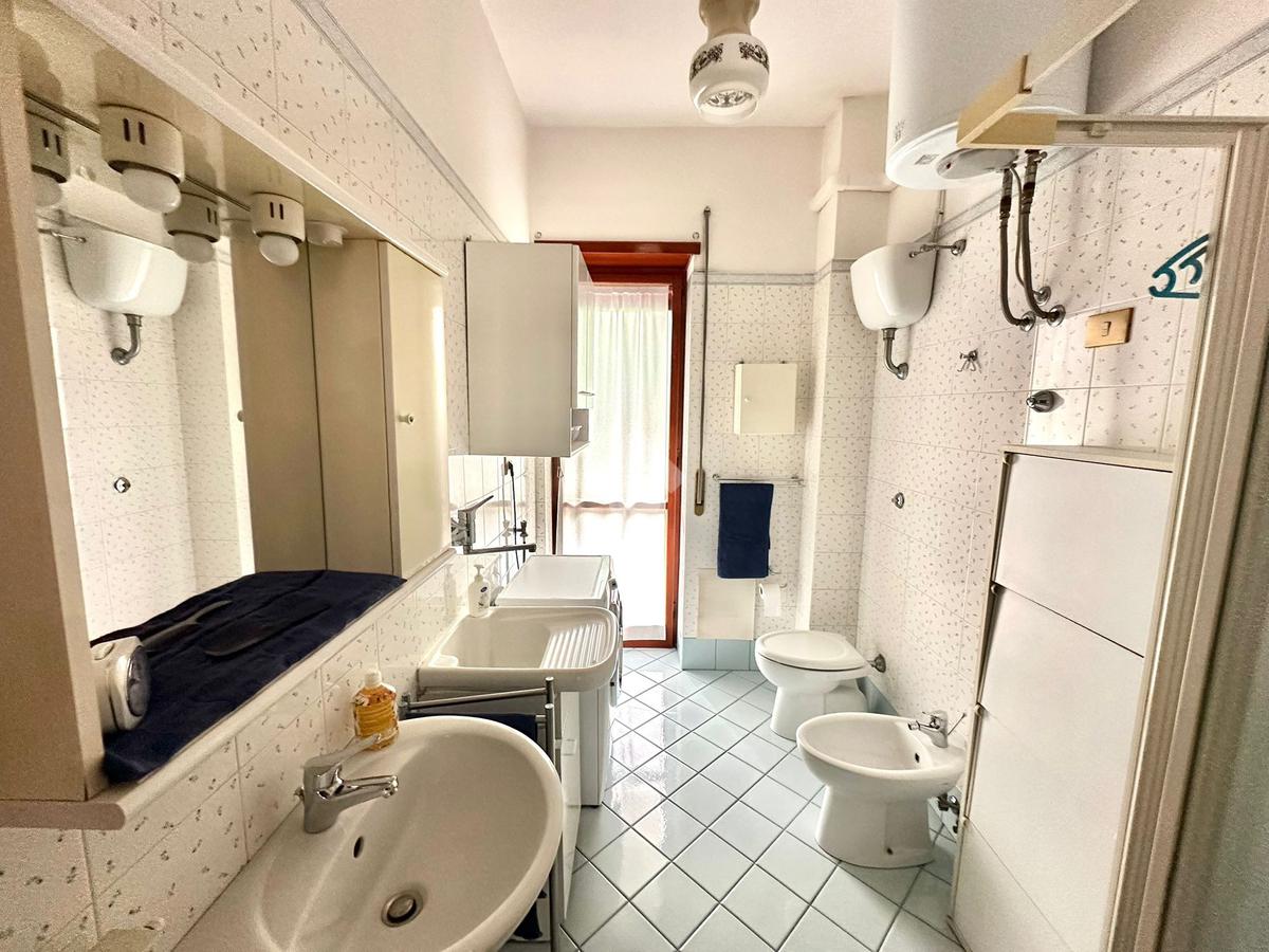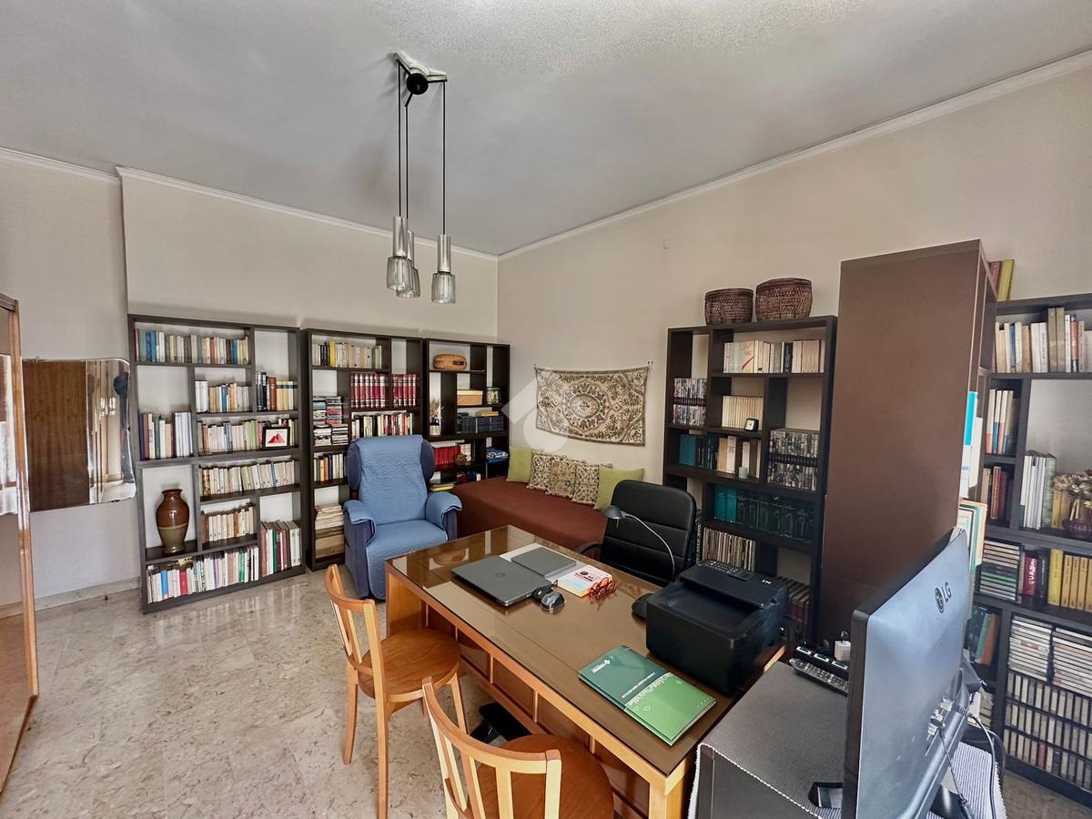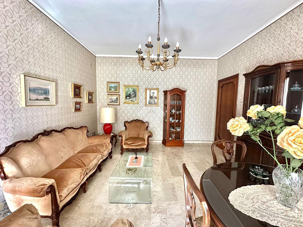 L'immobile, che si trova in un edificio in cemento armato dotato di ascensore, è composto da un ingresso in disimpegno, cucina abitabile, doppi servizi, salone e tre camere.