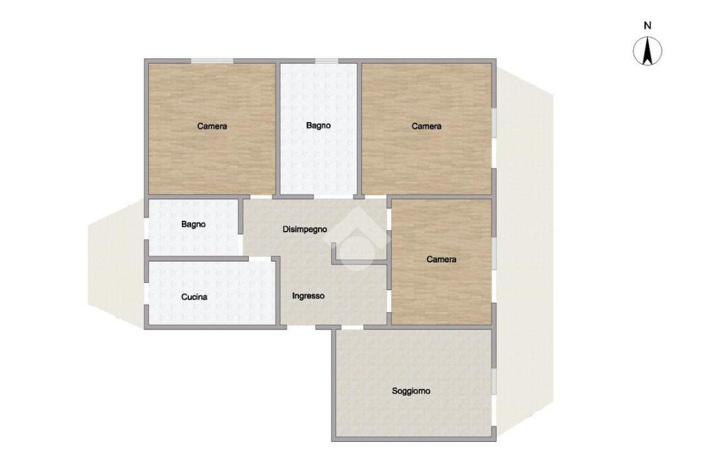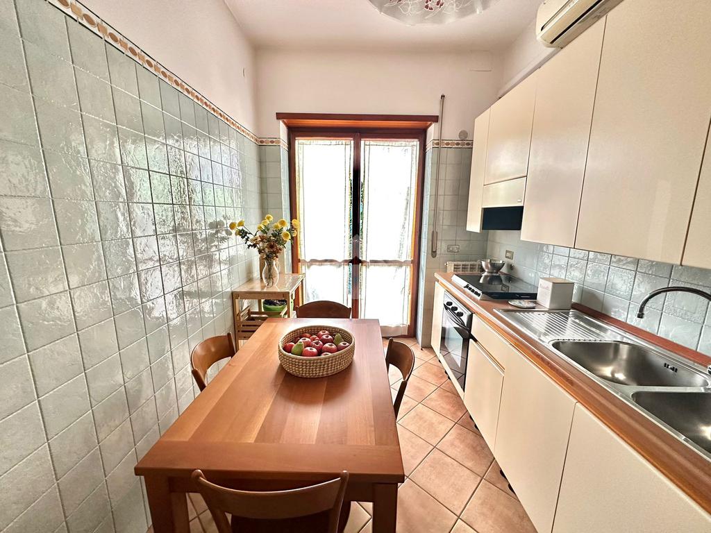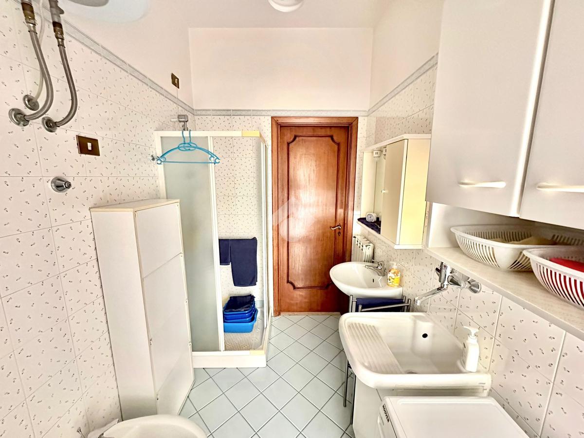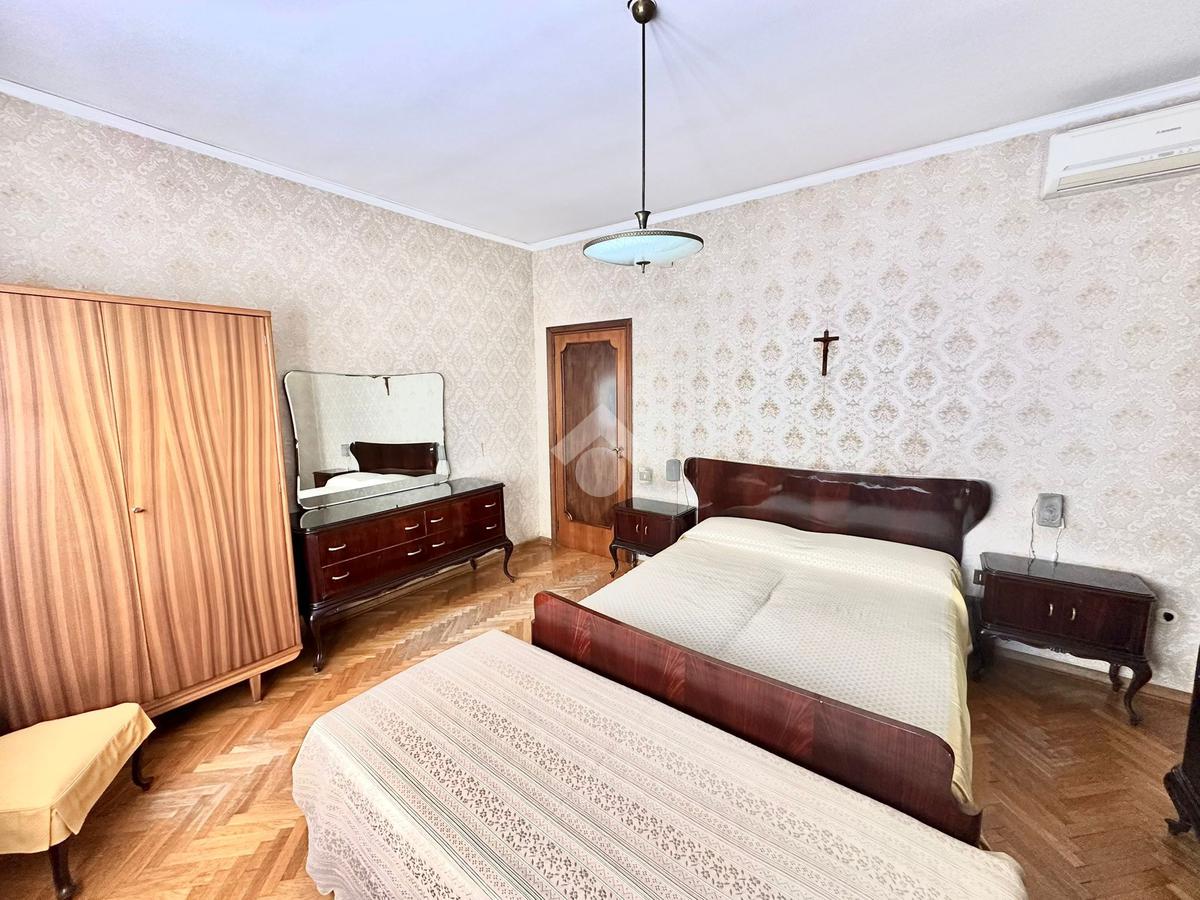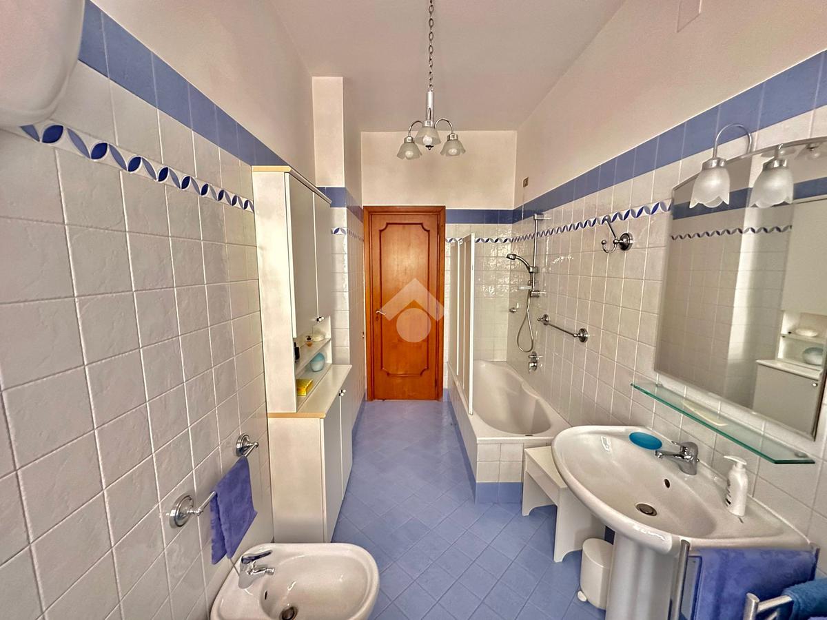 L'immobile, che si trova in un edificio in cemento armato dotato di ascensore, è composto da un ingresso in disimpegno, cucina abitabile, doppi servizi, salone e tre camere.